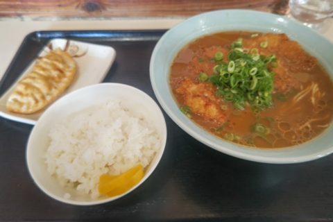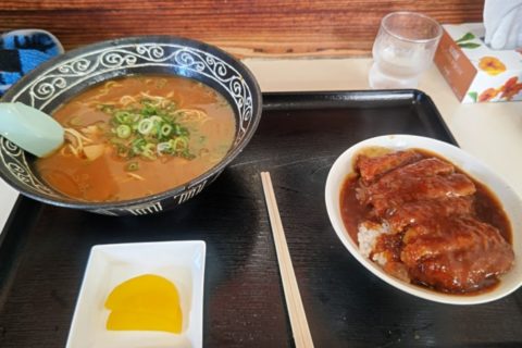 岡山名物デミカツ丼と豚骨醤油ラーメンの組み合わせは最高ですね〜